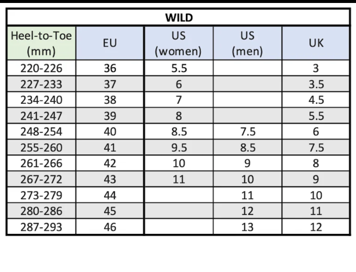 Our WILD models fit higher volume feet despite having the same insole dimensions as FLOW and FLOW S models. Therefore, if you are in between sizes we suggest to pick the smaller size.